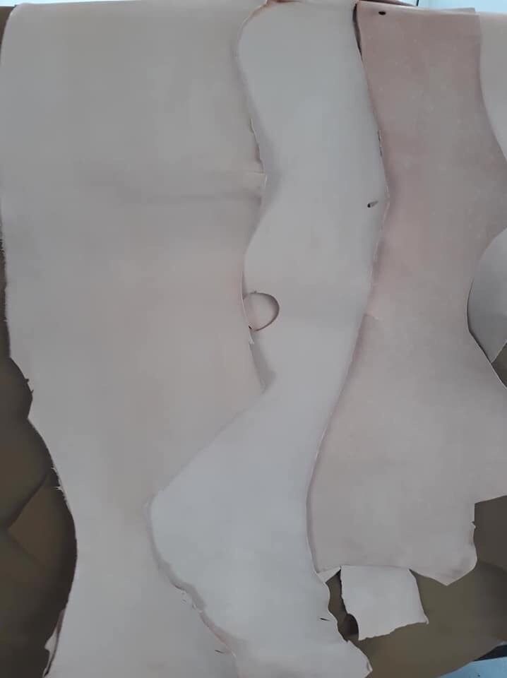 Fianco di Toro, conciato al vegetale, Pieno Fiore, circa 200cmX25/50cm, ideale per piccola oggettistica vista la sua irregolare forma lunga e stretta.